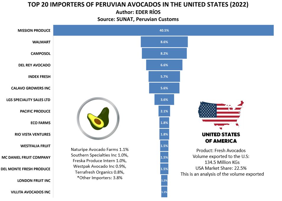 (Agraria.pe) Luego de haber realizado un ranking bastante comentado sobre los principales importadores de palta peruana en Europa durante el año pasado, el gestor de comercio internacional Eder Ríos presentó esta vez un segundo ranking. Ahora se trata de las 20 mayores empresas importadoras de dicho fruto nacional en fresco, pero desde el mercado de Estados Unidos en 2022.