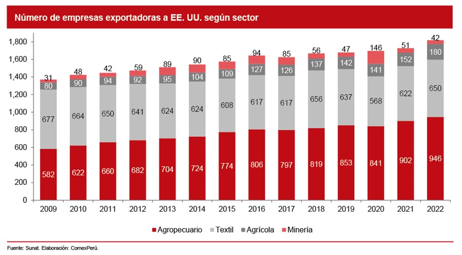 “Los mayores crecimientos en cuanto al número de empresas exportadoras entre el 2009 y 2022 se encuentran en las empresas del sector agropecuario, pasando de 582 a 946 y el agrícola de 80 a 180 para el mismo periodo de análisis”, sostuvo.