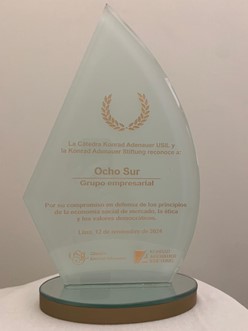 (Agraria.pe) La empresa palmicultora Ocho Sur fue distinguida con el Premio "Cátedra Konrad Adenauer USIL 2024", Categoría Sector Privado, por su compromiso en defensa de los principios de la economía social de mercado, la ética y los valores democráticos.