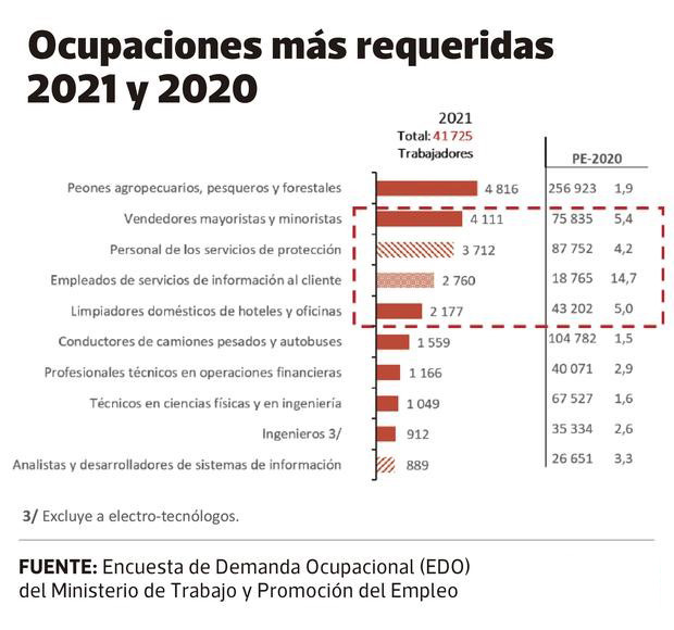 Asimismo, el personal de servicios de protección ha subido en el ranking, respecto a las proyecciones del año pasado. Las nuevas vacantes que se demandarían de empleados de servicios de información al cliente representan un incremento de 14.7%, respecto a la planilla del 2020 de dicha ocupación.
