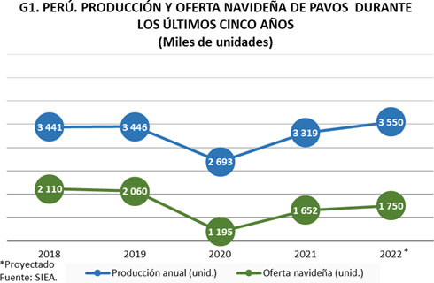 La producción nacional de pavo para el año 2022, alcanzaría las 3.550.000 unidades, lo que representaría un incremento de 7% (231 mil unidades más) respecto a las 3.319.000 unidades de pavos producidos en 2021.