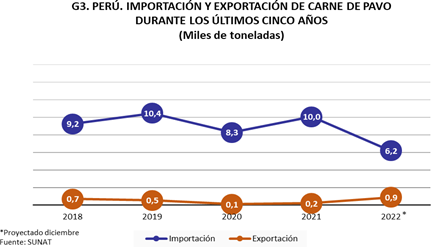 Del mismo modo, las importaciones de carne de pavo para este año se estiman en 6.173 toneladas, 3.865 toneladas menos a lo importado el año 2021. Las importaciones de pavo vienen ingresando como carne de pavo en trozos y provienen principalmente de Estados Unidos, Brasil y Chile. No se reportan importaciones de pavo entero para este año.