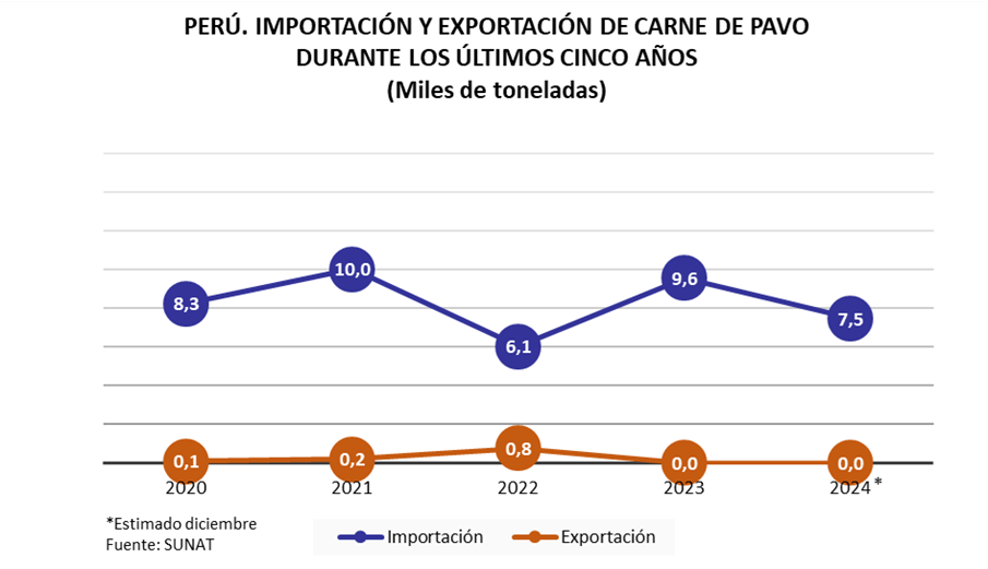 En cuanto a las exportaciones, en lo que va del presente año se despacharon 21.5 toneladas de pavo entero refrigerado y, no se registra exportaciones de pavo en trozos.