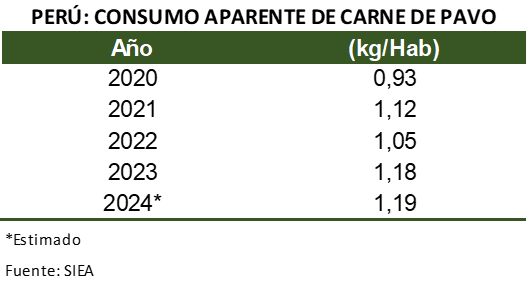Para el presente año, el consumo aparente de carne de pavo se estima alcanzará los 1,19 kilogramos por habitante, lo que representa un incremento de 1,3% con respecto al año 2023.
