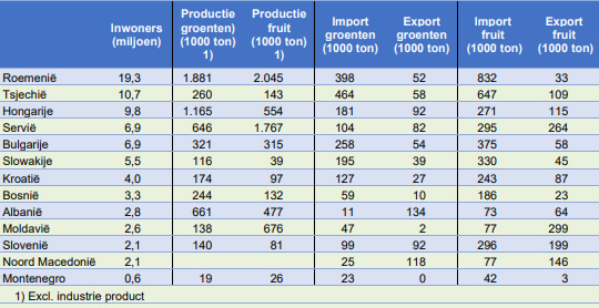 Los Países Bajos (re)exportan alrededor de 150.000 toneladas de frutas y hortalizas frescas a Rumanía cada año. El año pasado, los envíos bajaron por primera vez después de un período de continuo crecimiento. Hungría y Eslovaquia importan anualmente entre 50.000 y 60.000 toneladas desde los Países Bajos. El año pasado, Holanda exportó 38.000 toneladas de frutas y hortalizas frescas a Croacia, 25.000 toneladas a Serbia, 20.000 toneladas a Bulgaria y 16.000 toneladas a Eslovenia. Gran parte de los envíos holandeses son en realidad reexportaciones de, entre otros productos, bananas.