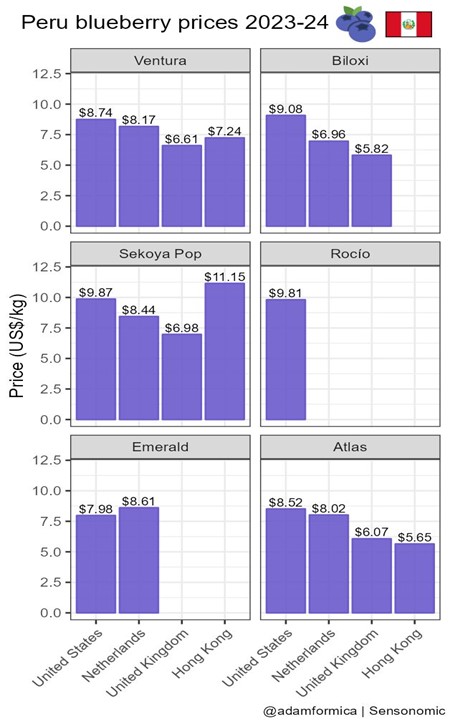 (Agraria.pe) ¿Cuáles fueron los precios de las principales variedades de arándanos por área plantada en Perú en 2023-2024 en los cuatro principales mercados de exportación?. “Típicamente, Estados Unidos siempre pagó más. La excepción es Sekoya Pop, por la que Hong Kong pagó US$ 1.28 más el kilo; y Emerald, por la que Países Bajos pagó US$ 0.63 más por kilo”, explica Adam Formica, director científico de Sensonomic.