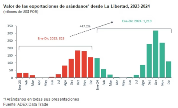 En 2024, La Libertad se consolidó como líder en la producción y exportación de tres de los diez principales productos agrícolas del Perú: el arándano, la palta y el espárrago.