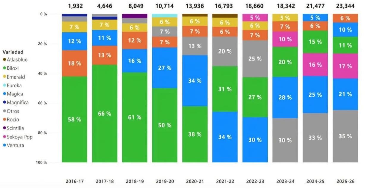 El gremio también detalló que en la presente campaña (2025/2026), las cinco principales variedades certificadas fueron: Ventura, que concentró el 21% del área total), seguida de Sekoya Pop que concentró el 17%, Biloxi 11%, Mágica 10%, Rocío 6%.