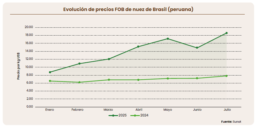 Entre enero y julio del 2025, los envíos peruanos de nuez de Brasil alcanzaron cerca de 2.713 toneladas por un valor de US$ 39 millones, lo que representa una caída de -28% en volumen, pero con un aumento cercano a +50% en valor. La explicación radica en un fuerte incremento de precios internacionales (+107%), impulsado por la escasez de producto tanto en Perú como en Bolivia.