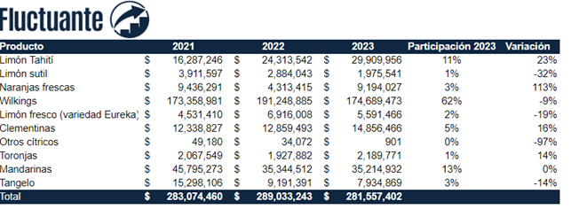 Cillóniz señaló que en los últimos cinco años la superficie de mandarinas de exportación pasó de 4.628 hectáreas en 2017 a 9.249 hectáreas en 2022. Las variedades más cultivadas son W. Murcott, con 4.077 hectáreas y Tango con 2.010 hectáreas.