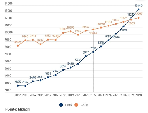 Dinamismo de las exportaciones agrícolas del Perú y Chile 2012-2022. Estimaciones 2023-2028 (millones de dólares americanos)