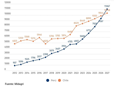 “De mantenerse esa dinámica en los siguientes años, para el 2027 Perú estaría exportando un valor de US$ 12.210 millones en productos agrícolas, superando a Chile que llegaría a US$ 12.009 millones”, señala César Romero, especialista en comercio exterior de la Dirección de Políticas del Midagri.