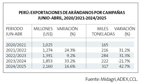 El arándano es una fruta que se produce por estaciones y que tiene a La Libertad como la región con más producción. Casi el 90% de lo que se cosecha se va al exterior, según explicó el especialista de Comercio Internacional del Ministerio de Desarrollo Agrario (Midagri) César Romero.