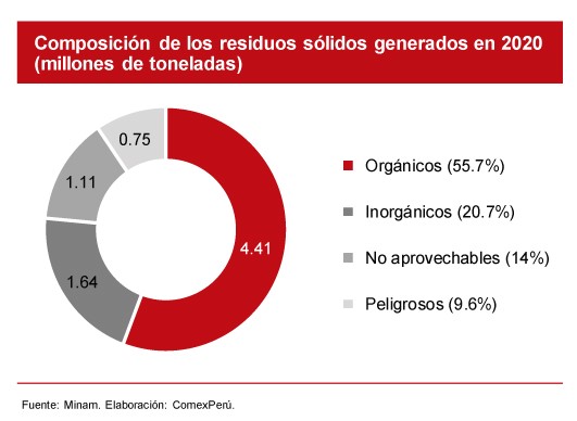 (Agraria.pe) De acuerdo con cifras del Ministerio del Ambiente (Minam), en 2020, Perú generó 7.9 millones de toneladas de residuos sólidos municipales (RSM). De estos, el 76.4% lo conforman residuos orgánicos e inorgánicos que tienen potencial de valorización (es decir, de ser aprovechables); sin embargo, solo se llegó a valorizar 59.021 toneladas, equivalentes a un 0.98%.