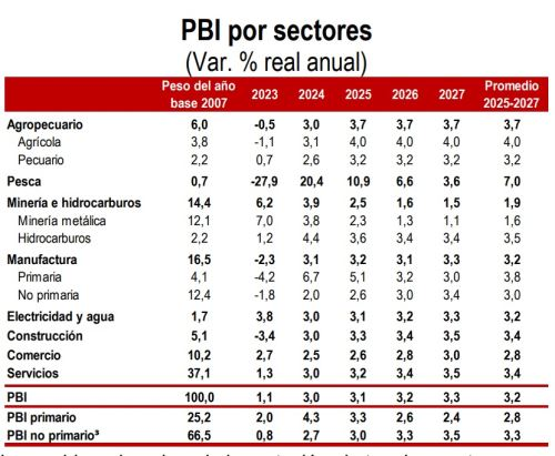 El documento precisa que de 2025 al 2027 el sector agrícola avanzaría 4 % y el pecuario 3.2 %, como promedio anual.