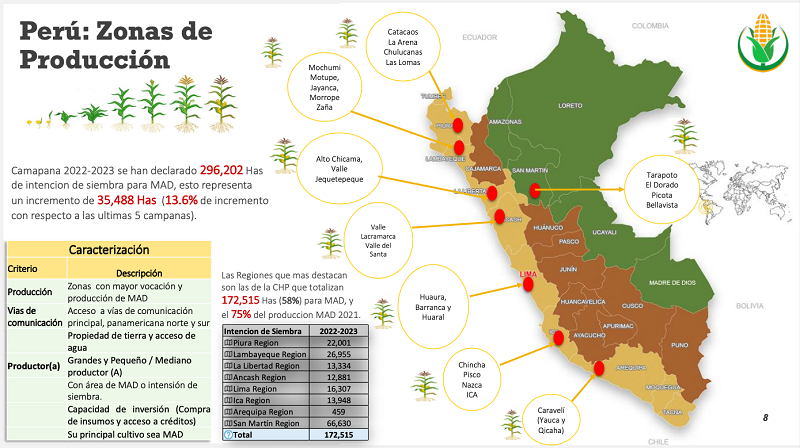 “Podemos generar una revolución productiva en el campo, sobre todo en los valles costeros de la costa y en la selva, donde se producen grandes cantidades de maíz amarillo duro. Nuestra producción nacional, que se acerca a un millón de toneladas se produce principalmente en los valles de Lambayeque, La Libertad, Áncash, Lima, Ica y San Martín, que se ha convertido en el primer productor. Y hay capacidades productivas, pero hay deficiencias también de productividad y competitividad para el grano”, describe Cabrera.