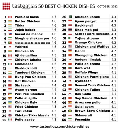 El prestigioso espacio de guía de viaje experiencial dio a conocer la noticia a través de su cuenta de Twitter, despertando el interés y los aplausos tanto de extranjeros como nacionales. “Clasificación mundial de platos de pollo, según los índices de audiencia de TasteAtlas. ¿Opiniones?”, la publicación estuvo acompañada por una fotografía.
