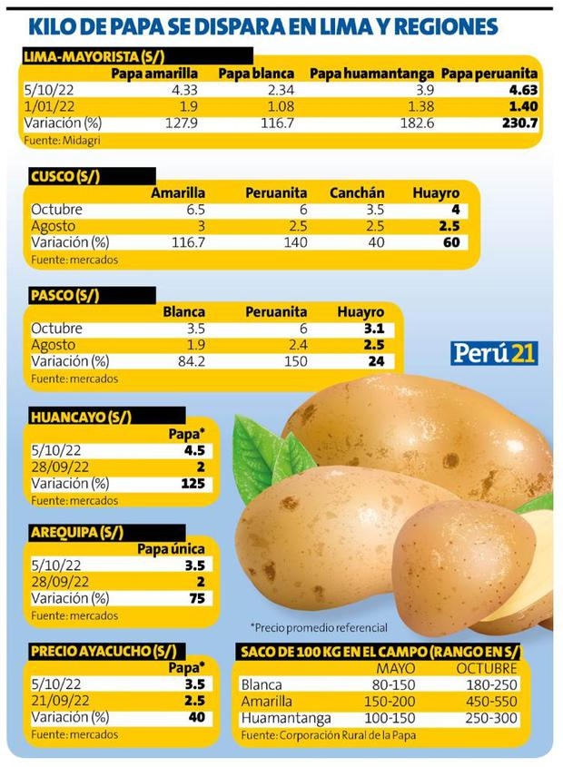 Ese es el caso de la papa peruanita, cuyo precio mayorista por kilo en Lima Metropolitana pasó de S/1.40 a S/4.63 entre el 1 de enero y el 5 de octubre. Incrementos fuertes también se han observado en variedades populares como la papa blanca, cuyo kilo subió de S/1.08 a S/2.34 en el mismo periodo, o la huamantanga, que pasó de S/1.38 a S/3.90 (ver infografía).