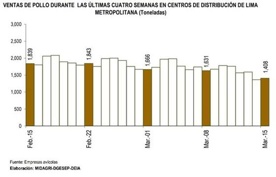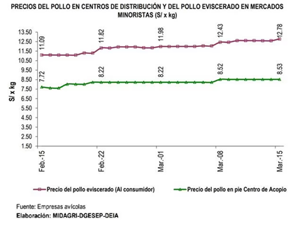 (Agraria.pe) Desde inicios de marzo, el precio del pollo en mercados minoristas de Lima fue en aumento hasta llegar a los S/12.78, según datos del Ministerio de Desarrollo Agrario y Riego (Midagri). Así también, las ventas de este producto han disminuido paulatinamente y pasaron de 2.020 toneladas el 14 de febrero a 1.364 toneladas este 14 de marzo, un 21.6% menos que el martes pasado.