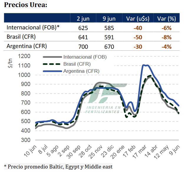 Los valores de los fertilizantes nitrogenados se siguen enfriando semana tras semana. Brasil compró 100.000 toneladas de urea a niveles de entre US$ 570 y US$ 620 la tonelada CFR (que incluye costo y flete), fundamentalmente de la mano de la urea rusa, que encuentra en Brasil el mercado más flexible para vender.