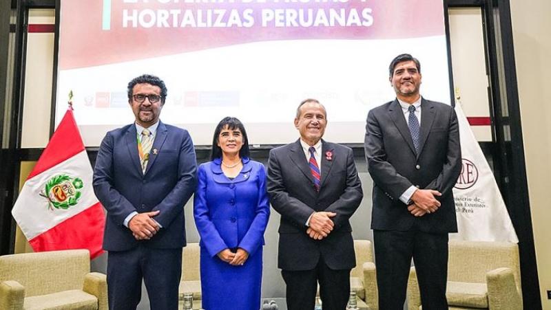 El evento, presidido por el canciller Elmer Schialer, contó con la participación como expositores de la titular del Mincetur, Desilú León y Luis Llanos, jefe de Agromercado, en representación del Ministerio de Desarrollo Agrario y Riego (Midagri), así como del director general de Preciso, Luis Corvera, y reunió a embajadores, gremios, empresarios y representantes del cuerpo diplomático.
