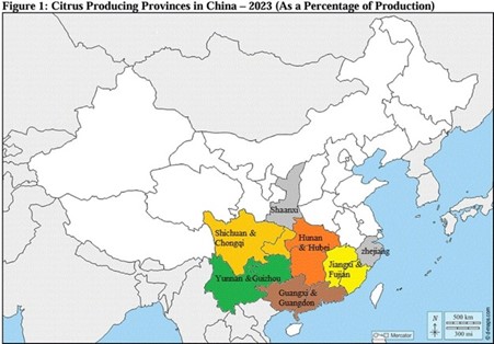China sigue siendo el mayor productor mundial de cítricos, con una producción dominante de naranjas, mandarinas, pomelos y toronjas. En 2023, China registró otro aumento de +7% en la cosecha de cítricos, alcanzando un total neto de más de 64 millones de toneladas métricas. Agrupadas por regiones, las mayores provincias citrícolas son Guangxi y Guangdong, en el sur de China, que representan aproximadamente el 38% del total del país.