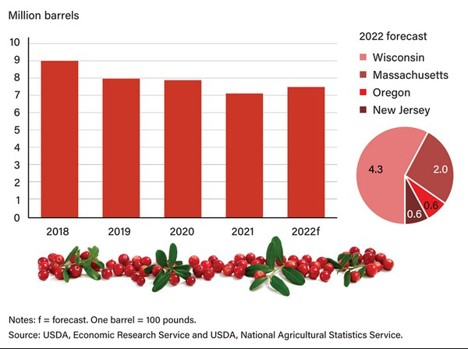 La producción de arándanos rojos, calculada por el Servicio Nacional de Estadísticas Agrícolas (NASS) del USDA, proviene de cuatro Estados: Wisconsin, Massachusetts, Oregón y Nueva Jersey. En Wisconsin, el mayor estado productor, se prevé una producción de 4,3 millones de barriles, un 3% más que el año pasado.