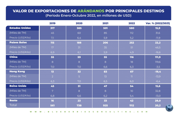 Los envíos de arándanos reportados hasta octubre de 2022 fueron valuados en US$1.112 millones, aumentando en un 20.2% respecto al mismo periodo en 2021.