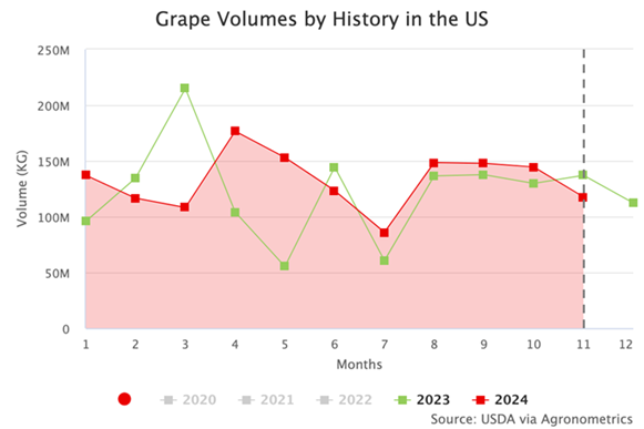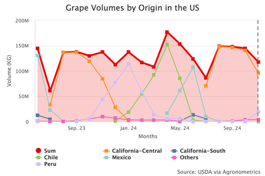 Según un informe sobre producción de cultivos del USDA/NASS, se espera que el aumento de la oferta nacional impulse las exportaciones en un 35%, hasta 245.000 toneladas, al tiempo que se reducirán las importaciones en más de 30.000 toneladas, hasta 760.000. A pesar del descenso de las importaciones, Estados Unidos seguirá siendo el mayor importador de uva de mesa.