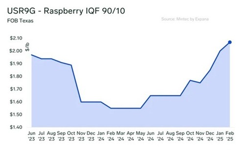 Esta escasez internacional está contribuyendo a la presión al alza de los precios. Los precios de referencia actuales de Expana para las frambuesas IQF FOB Texas se valoran en US$ 4.40 por kilo, lo que supone un incremento interanual del 29%. Esta tendencia de precios refleja una oferta mundial cada vez más ajustada y destaca la importancia de una producción nacional estable.