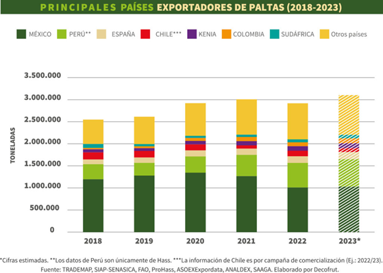 México continuará siendo el líder en la comercialización de paltas, con una producción y exportación de gran volumen y relativamente estable, sin ver grandes cambios en la tasa de crecimiento. Pese a que el país azteca abastece principalmente al mercado estadounidense, la búsqueda por expandir su presencia hacia otros destinos internacionales se encuentra activa, sobre todo en las últimas campañas donde se ha visto una mayor presencia en mercados como el europeo.