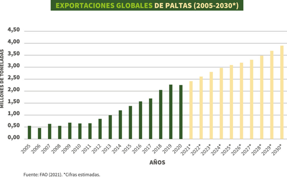 La tendencia de la última década indica que la industria de paltas podría seguir experimentando crecimientos, tanto en la producción como en la demanda. Según el reporte “Planeación Agrícola Nacional (2017 – 2023)” de la Secretaría de Agricultura, Ganadería, Desarrollo Rural, Pesca y Alimentación de México (SAGARPA), se proyecta que las importaciones mundiales de paltas al 2023 alcanzarían los 4.24 millones de toneladas, con México produciendo cerca de 3.16 millones de toneladas, manteniéndose como el principal proveedor de este producto a nivel global. Es más, la Organización para la Cooperación y el Desarrollo Económico (OCDE) y la Organización de las Naciones Unidas para la Alimentación y la Agricultura (FAO) en su informe de “Perspectivas Agrícolas 2021-2030”, también observan tendencias positivas, señalando que la palta se convertirá en la fruta tropical de más rápido crecimiento, con Latinoamérica y el Caribe liderando la producción. El documento señala que, para 2023, se espera ver cerca de 12 millones de toneladas de paltas a nivel mundial, con un potencial exportador de 3,9 millones de toneladas y con México participando en un 63% de los envíos mundiales (por debajo de la estimación de SAGARPA). Acorde a la OCDE-FAO, por otra parte, también se espera que Estados Unidos y la Unión Europea permanezcan como los principales importadores, con una participación de 40% y 31%, respectivamente al 2030.