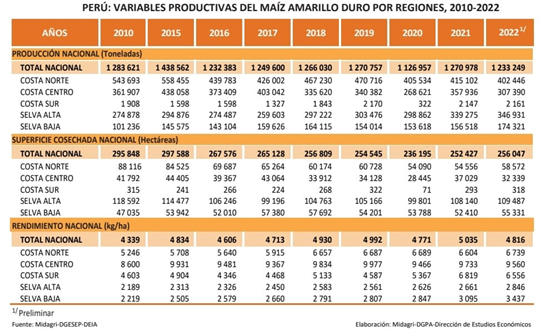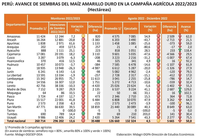 En la Encuesta Nacional de Intenciones de Siembra para la campaña agrícola 2022/2023, se estimó que las siembras de maíz amarillo duro alcanzarían un total de 296.202 hectáreas. Si se compara dicha cifra con el promedio de las últimas cinco campañas que alcanza las 260.714 hectáreas, se estimaba que las siembras aumentarían en 35 mil 488 hectáreas (+13.6%).