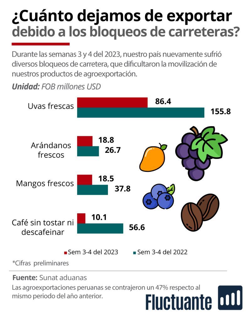 "Las protestas en nuestro país desde finales del año pasado han tenido un fuerte impacto en nuestras agroexportaciones, principalmente debido a los bloqueos de carreteras. Durante las semanas tres y cuatro, las agroexportaciones tradicionales y no tradicionales totalizaron un valor FOB de US$ 217.6 millones, sufriendo una contracción del 47% respecto al mismo periodo del año anterior, en el que se exportaron US$ 408.2 millones ", afirma David Sandoval, de la empresa de análisis de datos Fluctuante en Perú.