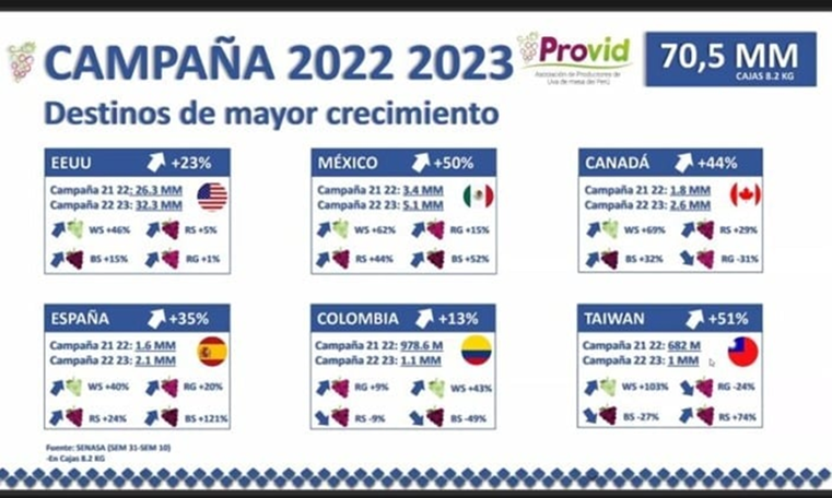 España crece un 35% esta temporada, pasa un 1.6 millones de cajas a 2.1 millones de cajas, con más homogeneidad en todos los grupos varietales. Colombia creció un 13% con un 1.1 millones de cajas, primando con las blancas sin semillas y Taiwán tuvo crecimiento de un 51% respecto de la temporada pasada y ha tenido un aumento de un 103% en blancas sin semillas, duplicando sus envíos y en las uvas rojas con un 74%.