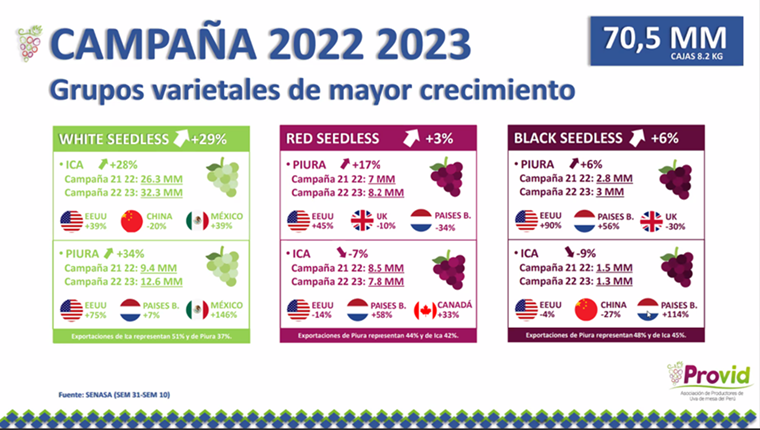 Fueron 56 variedades de uva de mesa exportadas por parte de Perú en la campaña 2022/2023. La principal variedad despachada es la Sweet Globe, representando el 23% del volumen y con un aumento del +33%. Le sigue la Red Globe 20%, Autumm Crisp 10%, Allison 5%, Sweet Celebration 5%. “Por primera vez la Red Globe no es la variedad más exportada de Perú, siendo superada por la Sweet Globe. Autumm Crisp ha crecido rápido y en corto tiempo”, señala el representante de Provid.