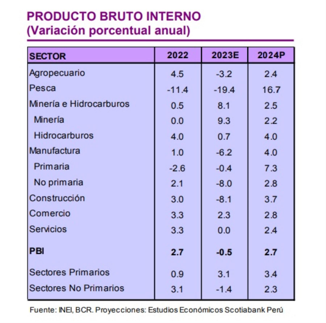 Por su parte, sectores asociados a la inversión privada como Construcción (+3.7%) mostraría un rebote menor al esperado -en el 2023 habría cerrado con una caída de 8.1%, según los estimados del Departamento de Estudios Económicos del Scotiabank.
