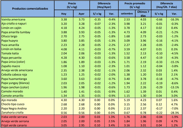 Otros productos que mostraron caídas en sus precios fueron las variedades de papa, pues cayeron entre 0.6% y 1.3%. La papa amarilla bajó en 1.3%, la papa huayro en 1.3%, la papa única en 1.3%, la yungay en 1.2%, la papa huamantanga en 0.7%, la peruanita en 0.6% y la canchán en 0.6%.