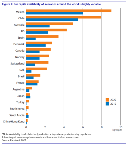 En términos de disponibilidad de palta per cápita (que se utiliza como indicador de consumo), México lidera la categoría, con un récord mundial de alrededor de 9 kg de aguacate fresco por persona al año, seguido de Chile con casi 8 kg, Australia y Estados Unidos completan la lista de países con más de 4 kg per cápita (ver Figura 4 ). En Europa, el consumo per cápita varía mucho.