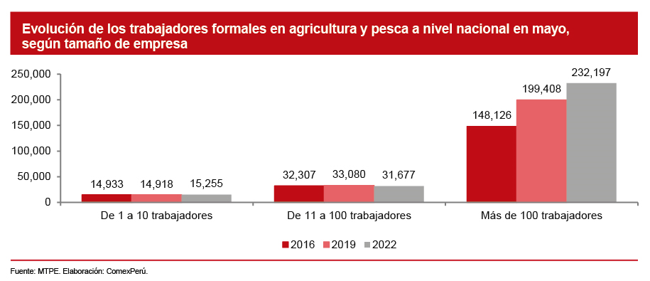 Si bien la cantidad de empleos formales en el sector agricultura y pesca ascendió a 279.129 a nivel nacional, en mayo del presente año, lo que significó un crecimiento del 12.8% con respecto al mismo mes de 2019, según el Ministerio de Trabajo y Promoción del Empleo (MTPE), este incremento no es suficiente para compensar los efectos nocivos que el nuevo régimen genera para la formalización del sector. Sobre todo, al considerar que la mayoría de los trabajadores formales del sector pertenecen a las empresas de mayor tamaño, pues aquellas con más de 100 trabajadores explicaron el 83.2% de los empleos formales, proporción que continúa al alza desde 2016.