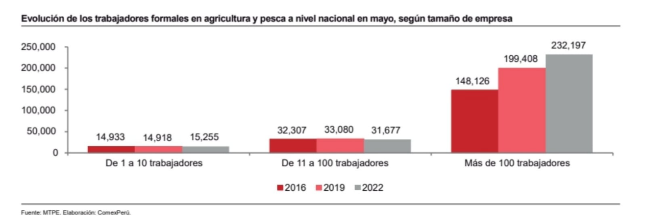 Sí bien la cantidad de empleos formales en el sector agricultura y pesca ascendió a 279.129 a nivel nacional, en mayo del presente año, lo que significó un crecimiento del 12.8% al mismo mes del 2019, según el Ministerio de Trabajo y Promoción del Empleo (MTPE), este incremento no es suficiente para compensar los efectos nocivos que el régimen genera para la formalización del sector. Sobre todo, al considerar que la mayoría de los trabajadores formales del sector pertenecen a las empresas de mayor tamaño, pues aquellas con más de 100 trabajadores explicaron el 83.2% de los empleos formales, proporción que continúa al alza desde 2016.