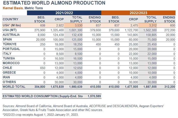 La cosecha mundial de almendras en 2023 se estimó en 1.400 millones de toneladas métricas (grano), y se espera que crezca un 5% en los próximos cinco años, una tendencia impulsada por la adopción de dietas basadas en plantas y opciones alternativas a las alergias como la intolerancia a la lactosa en productos lácteos.