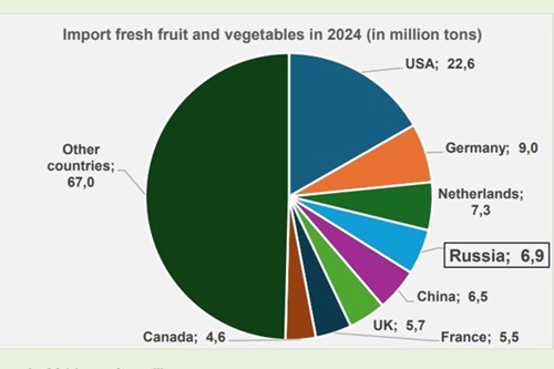(Agraria.pe) Rusia es un gran importador mundial de frutas y hortalizas frescas. Se calcula que en los últimos años ha importado unos 7 millones de toneladas, lo que la sitúa en el cuarto puesto a nivel mundial, solo por detrás de Estados Unidos (22,5 millones de toneladas), Alemania (9,0) y Países Bajos (7,3), y por delante de China (6,5) y Reino Unido (5,7).