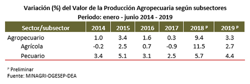 (Agraria.pe) El Ministerio de Agricultura y Riego (Minagri) dio a conocer que sector el agropecuario acumuló una expansión de 3.3% en el primer semestre (enero-junio) en comparación a similar periodo de 2018, lo que acredita el buen comportamiento del campo en los últimos meses.