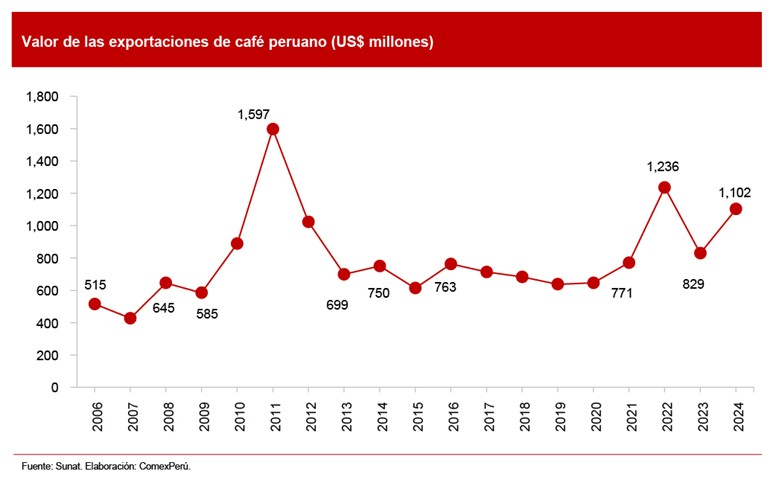 “El estancamiento de la producción nacional se refleja en los envíos al exterior. El valor de exportaciones de café peruano alcanzó su máximo histórico en 2011, cuando registraron US$ 1.597 millones, después de lo cual la caída en la producción y los precios causaron que retroceda en más de la mitad en 2013 (según cifras de la Sunat). Sin embargo, inclusive con nuevos máximos en cotizaciones internacionales, las exportaciones no lograron recuperarse”, señaló ComexPerú.