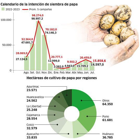 De esta manera, en Puno -productor número uno de papa- la intención de siembra caerá 2.076 hectáreas y se ubicará en 61.681 ha, lo que equivale a una contracción de 3.3% en un año.