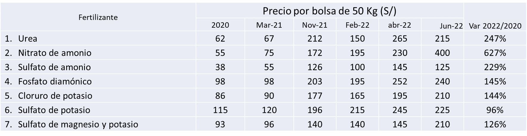 Variación anual de precios de los principales fertilizantes utilizados por los pequeños agricultores familiares entre el 2020 y 2022 (S/)