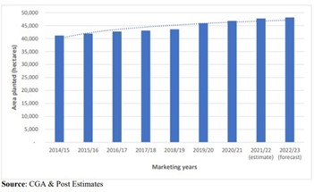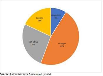 Los campos de cítricos en Sudáfrica abarcan más de 100.000 hectáreas (ha), de las cuales los campos de naranjos representan aproximadamente el 47%. La superficie plantada de naranjas creció casi un 14% en los últimos 7 años o una media de un 2% anual. El crecimiento de la superficie de naranja se vio limitado por un cambio agresivo hacia los cítricos del grupo de mandarinas y clementinas en las regiones de cultivo de las provincias del Cabo Occidental y Limpopo.