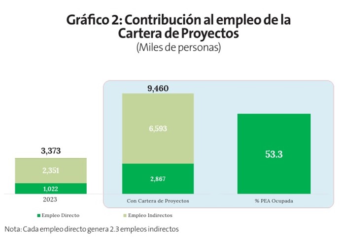En el gráfico 1 podemos ver la cartera de proyectos que podrían sacarse adelante. Estamos hablando de que podríamos incorporar más de 500,000 hectáreas a actividades de agroexportación, lo cual implicaría prácticamente triplicar las hectáreas actuales dedicadas a la agroexportación. El impacto en el empleo se puede ver en el gráfico 2. Actualmente, la agroexportación ha generado más de 3’300,000 puestos de trabajo entre directos e indirectos. Con la cartera de proyectos estaríamos creando más de 6 millones de nuevos puestos formales de empleo.