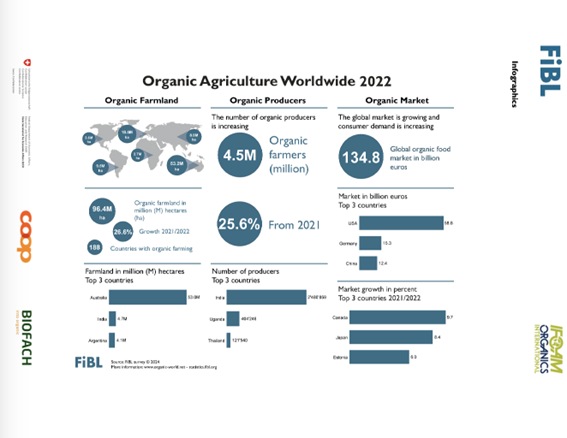 Las ventas mundiales de alimentos orgánicos también van en aumento, alcanzando casi US$ 14.4 billones en 2022, según las últimas cifras y el anuario estadístico "El mundo de la agricultura ecológica", publicado conjuntamente por FiBL e IFOAM, y que este año se publica por 25ª vez.